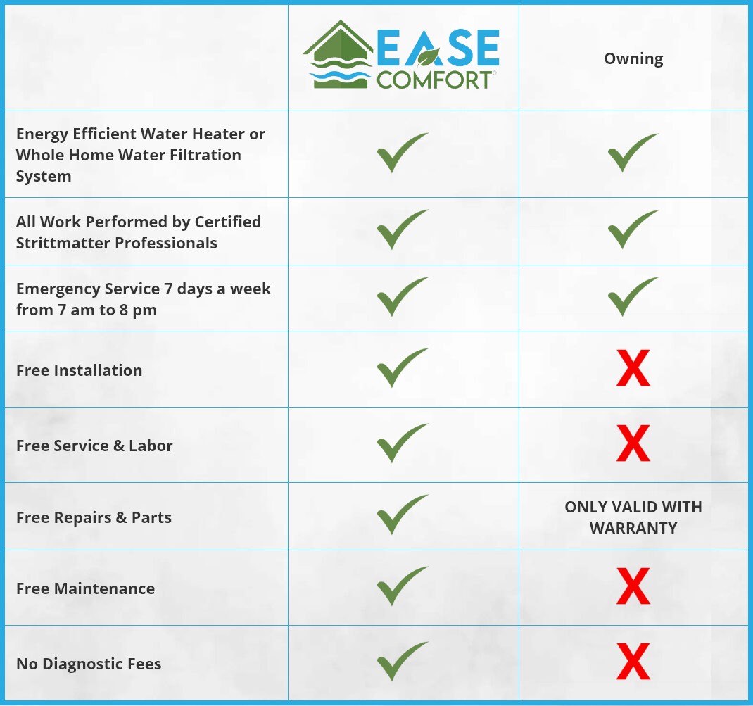 The old way means paying thousands of dollars to replace your water heater. The easy way is the EASE Comfort®️ way, exclusively from Strittmatter. This revolutionary program lets you upgrade to a new energy-efficient water heater for as low as $42 per month. Plus, you enjoy the peace of mind of a LIFETIME warranty – with all parts, services, and maintenance covered for the life of your water heater.